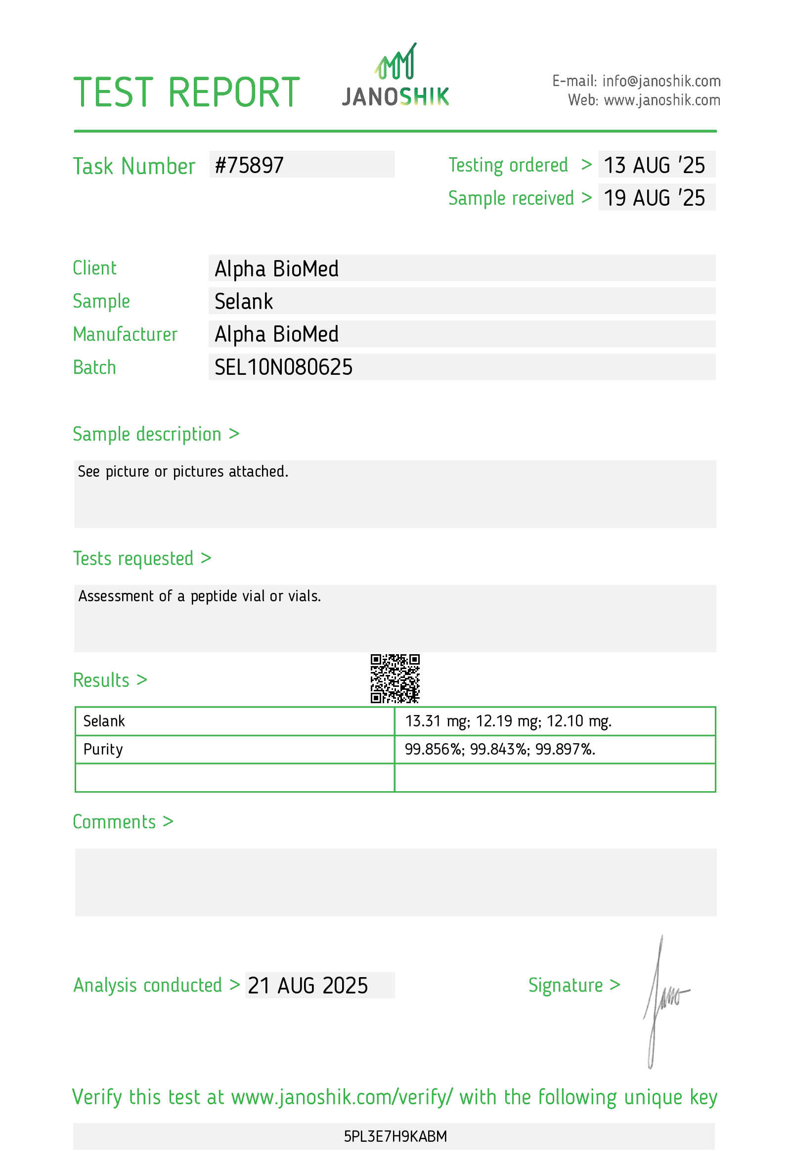 Issued under Alpha Bio Med Labs, the authorized testing and distribution partner.